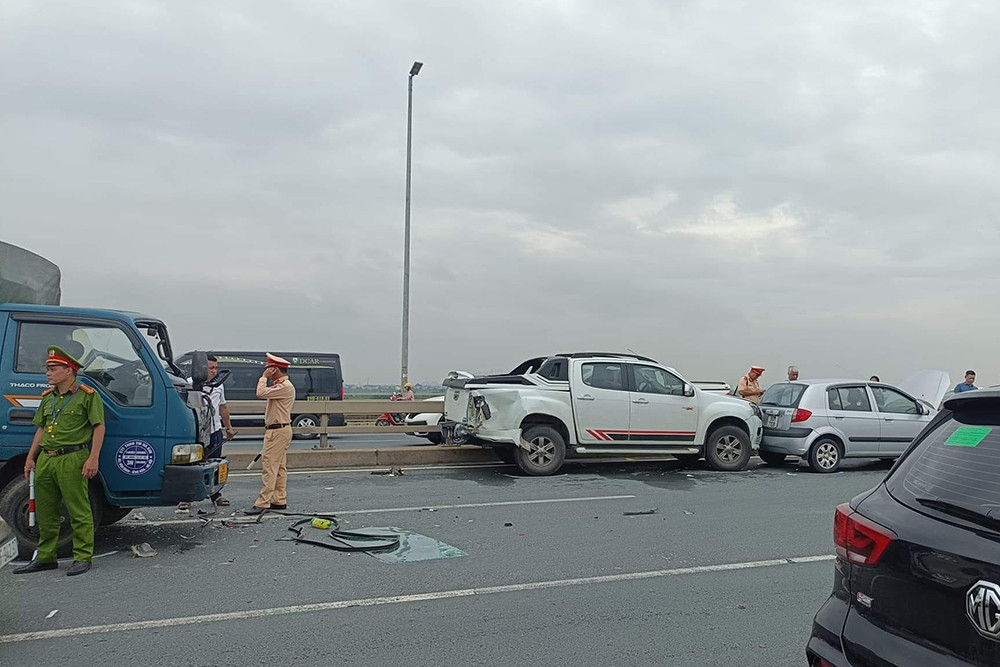 Sau đó, xe mang BKS 29C - 385.XX lưu thông cùng chiều đâm liên hoàn vào 2 ô tô trên. Thời điểm xảy ra tai nạn, cả 2 xe con đều bật xi nhan khẩn cấp nhưng chưa có vật cảnh báo.