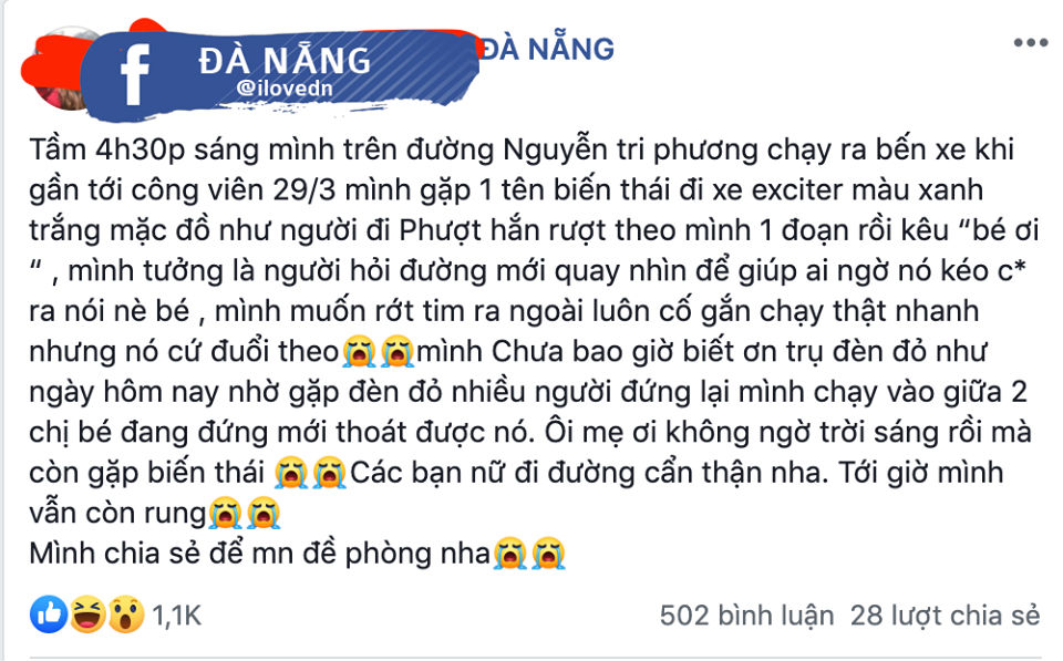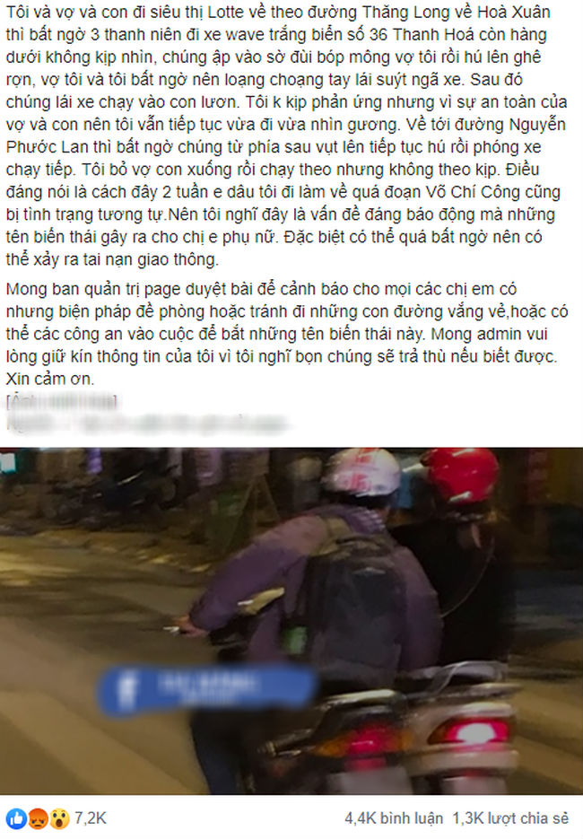 Theo đó, vụ việc diễn ra vào tối ngày 1/8. Vì quá bức xúc trước sự việc cũng như muốn cảnh báo đến mọi người, đặc biệt là các bạn nữ hay đi làm, đi chơi qua đoạn đường này, người chồng đã đăng tải lên mạng xã hội toàn bộ câu chuyện lên mạng xã hội.