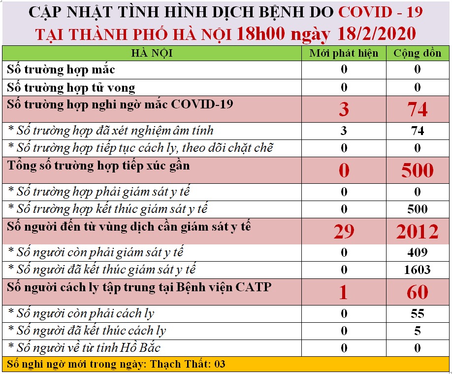 Tuy nhiên, đến chiều 18/2, 3 trường hợp nghi ngờ được phát hiện tại Thạch Thất đã có kết quả xét nghiệm âm tính với nCoV. Như vậy, theo thống kê đến 18h hôm qua, 74/74 trường hợp nghi ngờ nhiễm nCoV đã có kết quả xét nghiệm âm tính