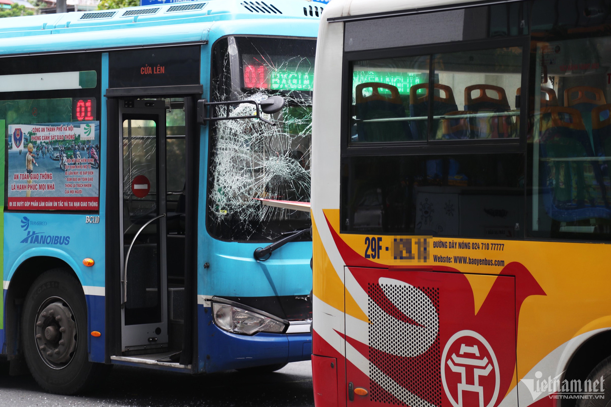 Tiếp đó, xe buýt mang BKS 29F-002.XX đang lưu thông cùng chiều đâm vào xe buýt chạy tuyến 57. Cú va chạm mạnh khiến hành khách trên 3 xe buýt trên hốt hoảng.