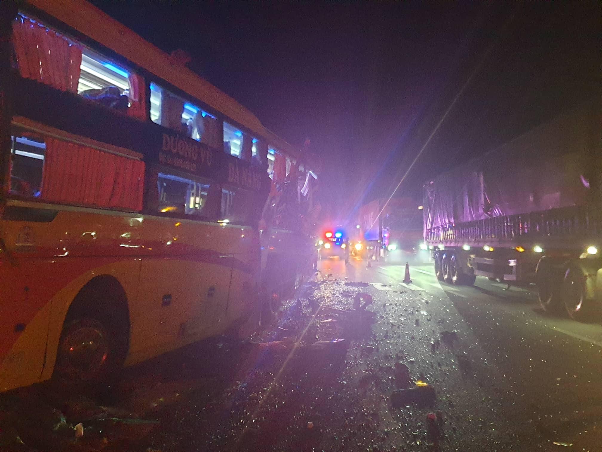 Tại hiện trường, phần đầu xe container lao vào bên vệ đường, bể nát; xe khách và xe ô tô 5 chỗ hư hỏng nặng