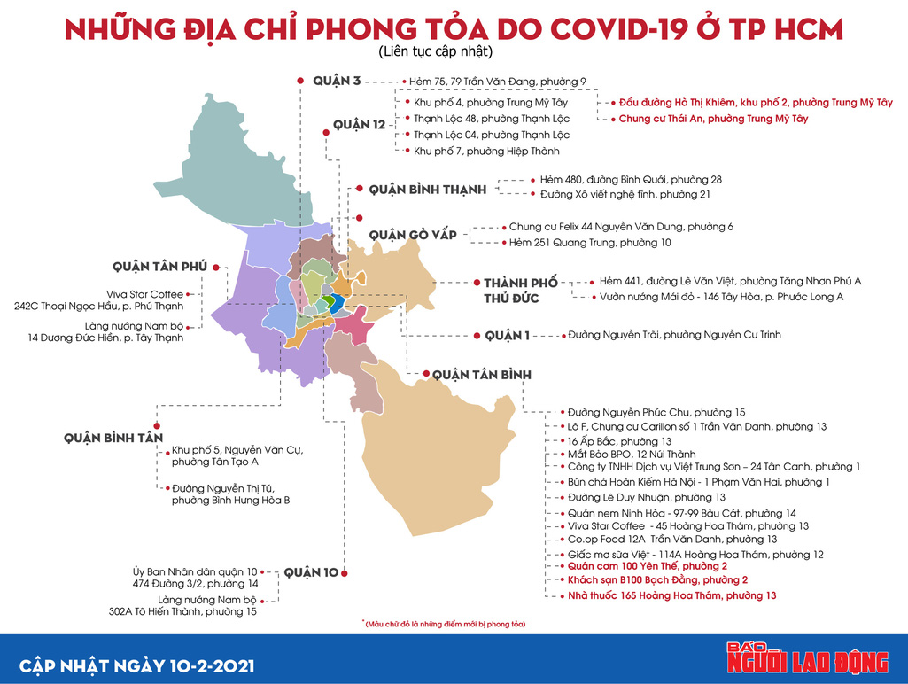 Tối 10-2, Trung tâm Kiểm soát bệnh tật TP HCM cập nhật thông tin về các điểm phong tỏa trên địa bàn TP vì liên quan ca mắc Covid-19.