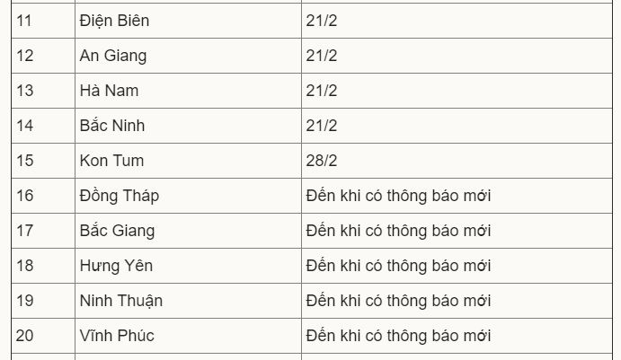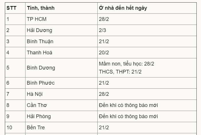 Các địa phương này cho toàn bộ học sinh các cấp dừng đến trường, nhưng yêu cầu nhà trường tổ chức dạy và học theo đúng chương trình năm học 2020-2021 với hình thức phù hợp, trong đó chủ yếu chuyển sang dạy trực tuyến.