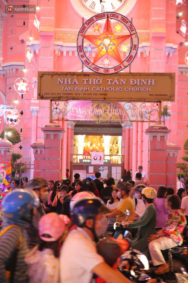 Không kém cạnh nhà thờ Đức Bà, nhà thờ Tân Định (nhà thờ màu hồng) cũng đông kín lối từ ngoài đường vào tới khuôn viên bên trong.