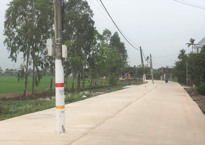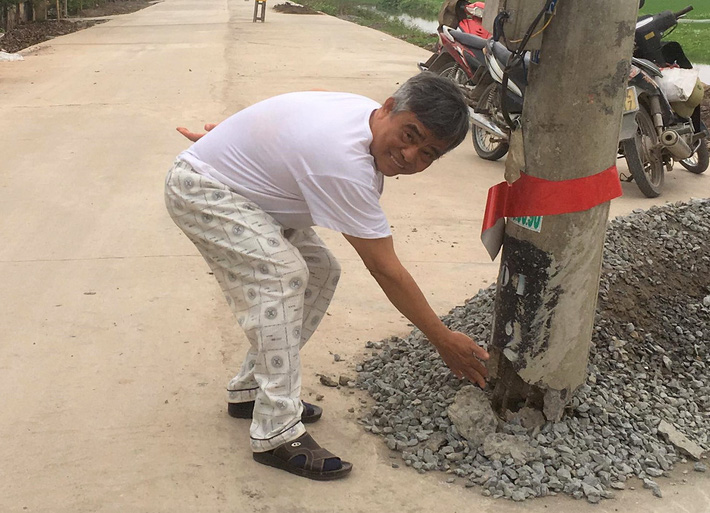 Ông Hà Văn Sen (SN 1939; ngụ xóm 2, xã Khánh Thủy) cho biết những cột điện này trước đây đứng bên đường, nhưng từ năm 2020, khi con đường bê-tông được mở rộng, chúng trở thành đứng giữa đường.