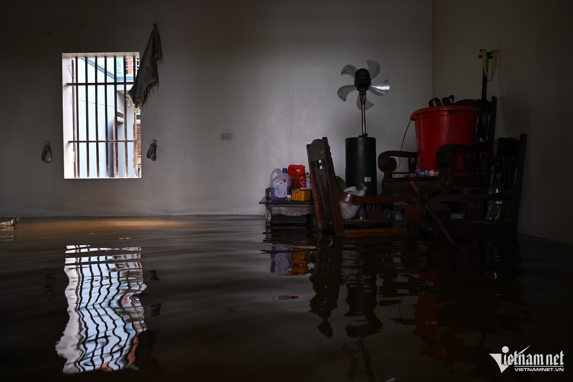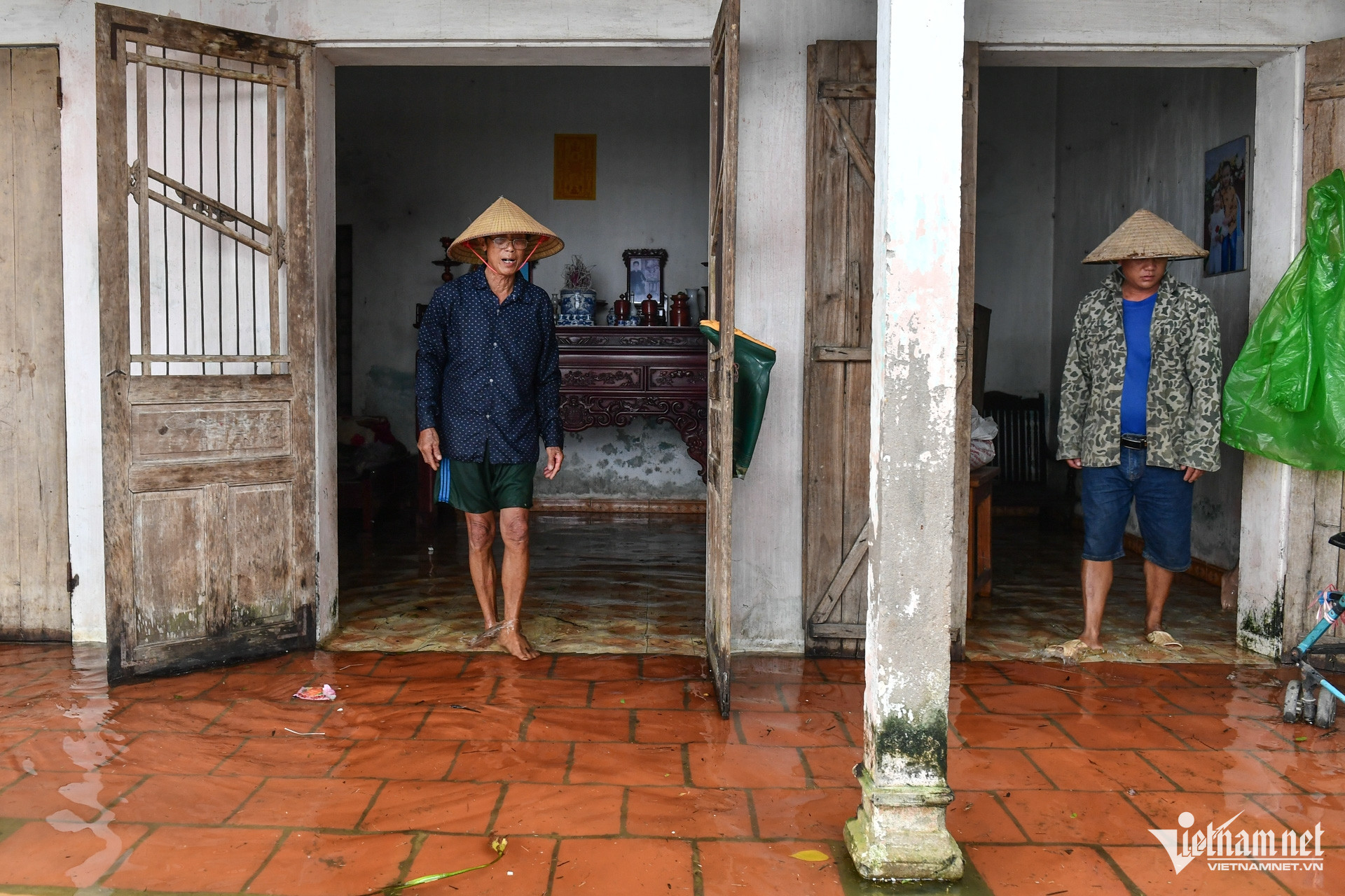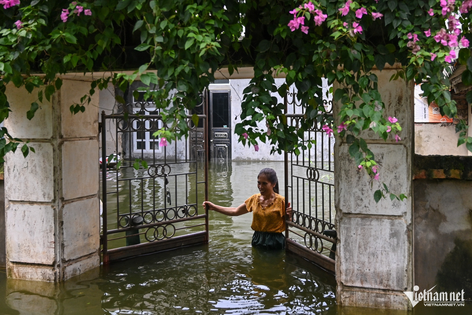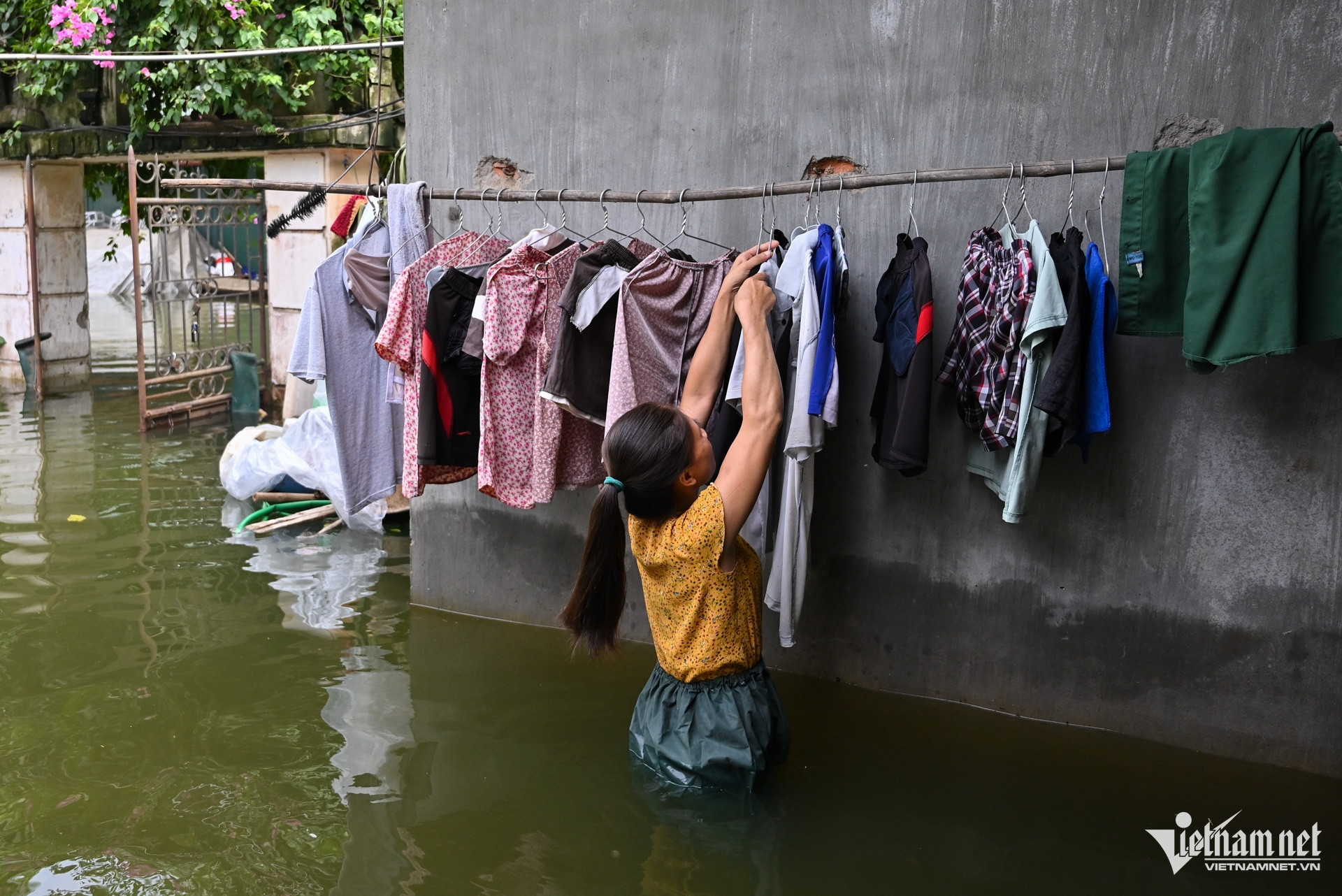 Xỏ vào chiếc ủng quần chống thấm, bà Hoài (vợ ông Ngọc) dò từng bước ra sân thu nốt dây quần áo mới phơi khô. "Trời quang nắng ráo mới được vài ngày, nước vừa rút được chút thì cơn mưa đêm qua lại bồi vào. Tôi ra ngoài bờ đê thấy nước còn cao lắm, chừng nào ngoài ấy còn nước thì nhà tôi vẫn chưa hết ngập", bà Hoài cho biết.