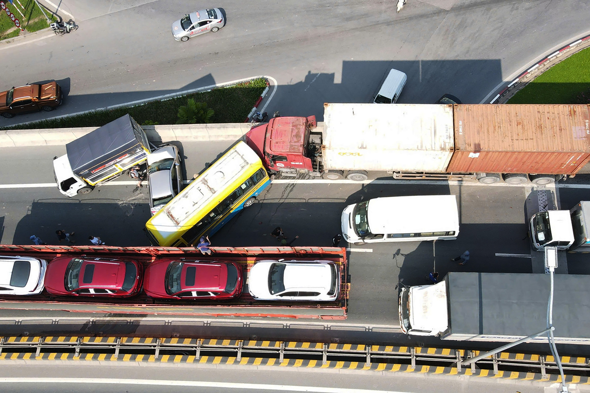 Cụ thể, vụ tai nạn xảy ra vào khoảng 14h30 cùng ngày, tại đoạn đường dẫn lên cầu Thăng Long (hướng từ quận Cầu Giấy - huyện Đông Anh). Vụ va chạm có 5 ô tô gồm xe đầu kéo mang BKS 15C - 067.XX, xe đầu kéo mang biển số rơ - moóc 92R- 008.XX, ô tô khách biển số 89F - 001.XX, xe tải biển số 29H - 528.XX và một ô tô con chưa rõ BKS.