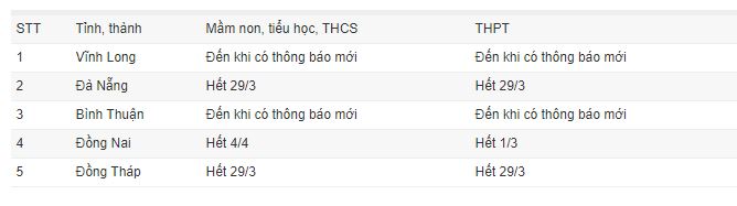 UBND tỉnh Đồng Tháp cũng thống nhất cho học sinh tại các cơ sở giáo dục mầm non, tiểu học, trung học cơ sở, trung học phổ thông, giáo dục thường xuyên và học viên, sinh viên của các cơ sở giáo dục nghề nghiệp trên địa bàn tỉnh nghỉ học từ ngày 13/3 đến hết ngày 29/3.