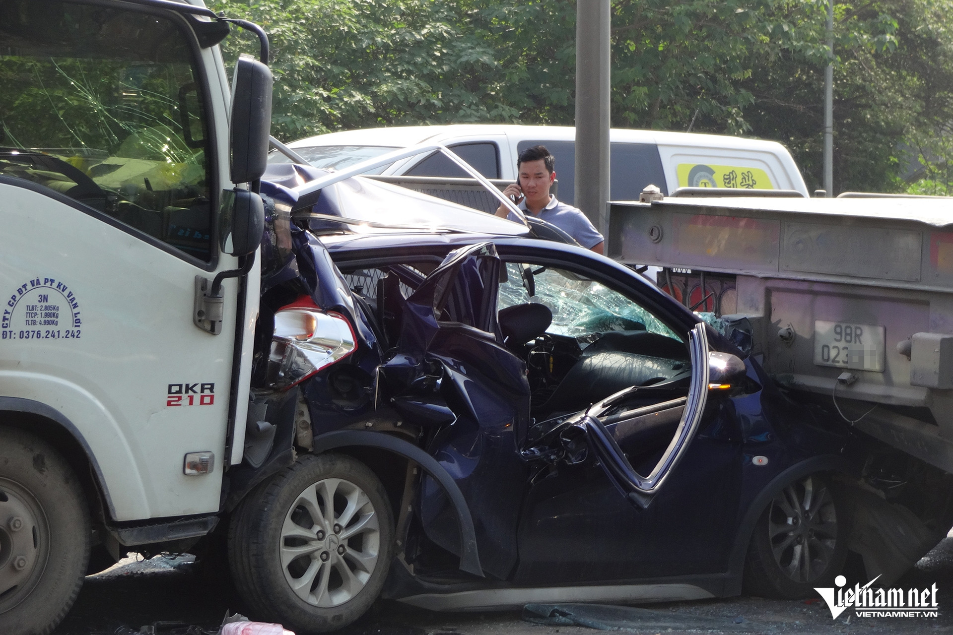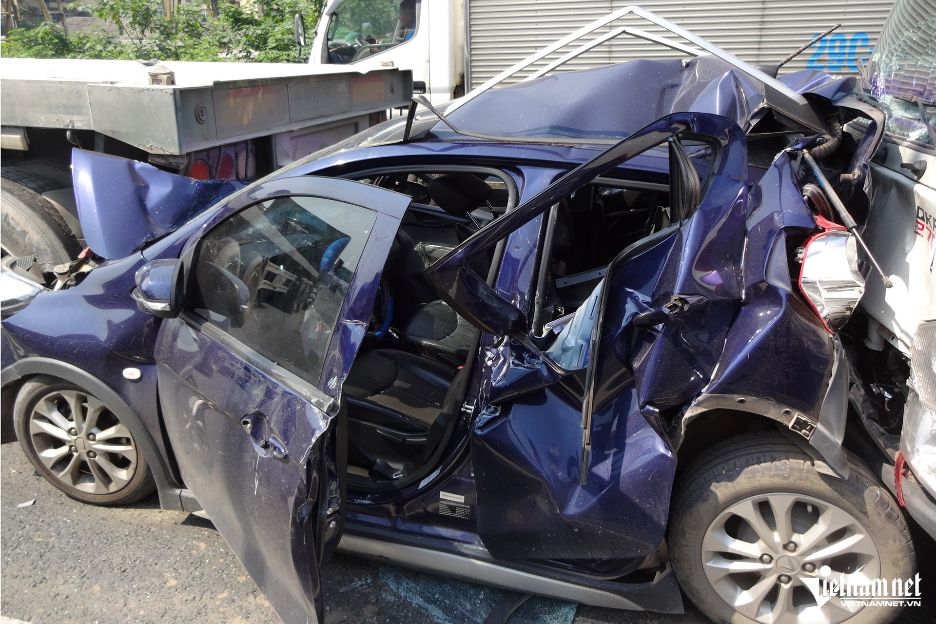 Nhân chứng tại hiện trường cho biết, vụ tai nạn có 6 ô tô đâm dồn toa, gồm: 2 xe container, 2 xe tải và 2 xe con. Trong đó, 1 ô tô con bị kẹp ở giữa xe container và xe tải khiến 4 người mắc kẹt bên trong.