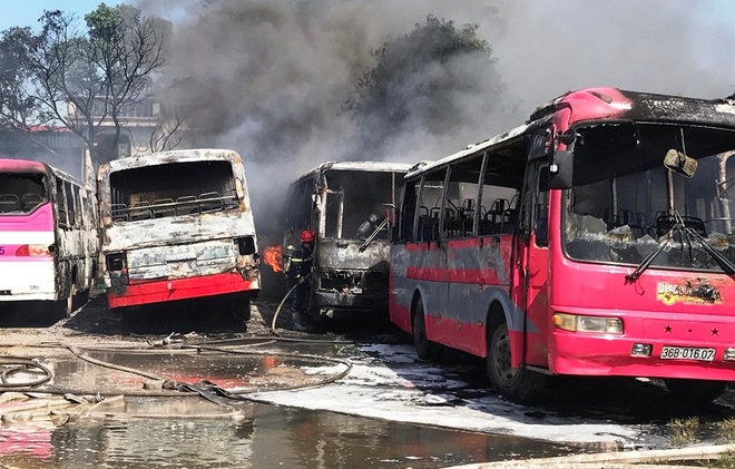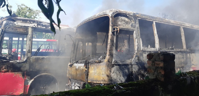 Hơn 30 phút sau, đám cháy được dập tắt nhưng 6 xe loại 29-52 chỗ bị hư hỏng nặng. Trong đó, 4 ôtô bị cháy trơ khung.