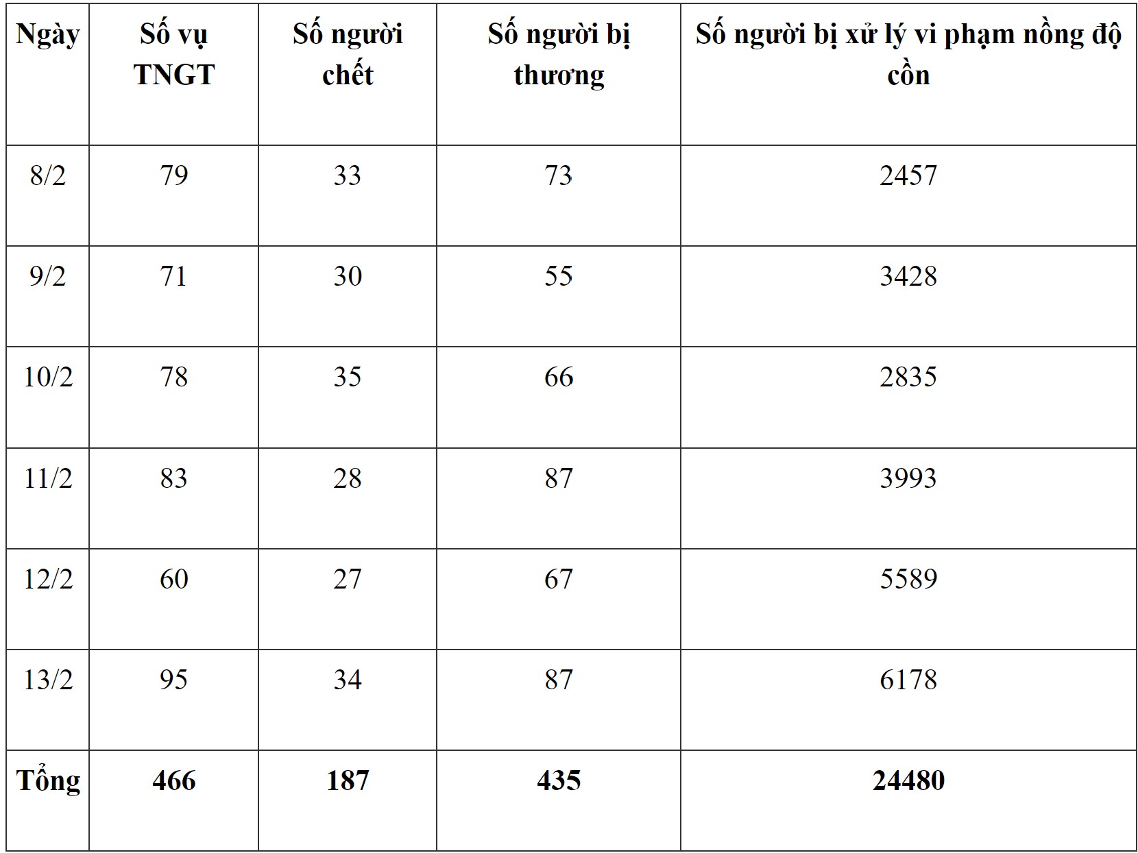 Liên quan đến tình hình trật tự, an toàn giao thông ngày 13/2 (tức mùng 4 Tết), Ủy ban An toàn giao thông quốc gia cho biết, toàn quốc xảy ra 95 vụ tai nạn giao thông, làm chết 34 người , bị thương 87 người. So với ngày 12/2 (mùng 3 Tết), tăng 35 vụ, tăng 7 người chết, tăng 20 người bị thương.