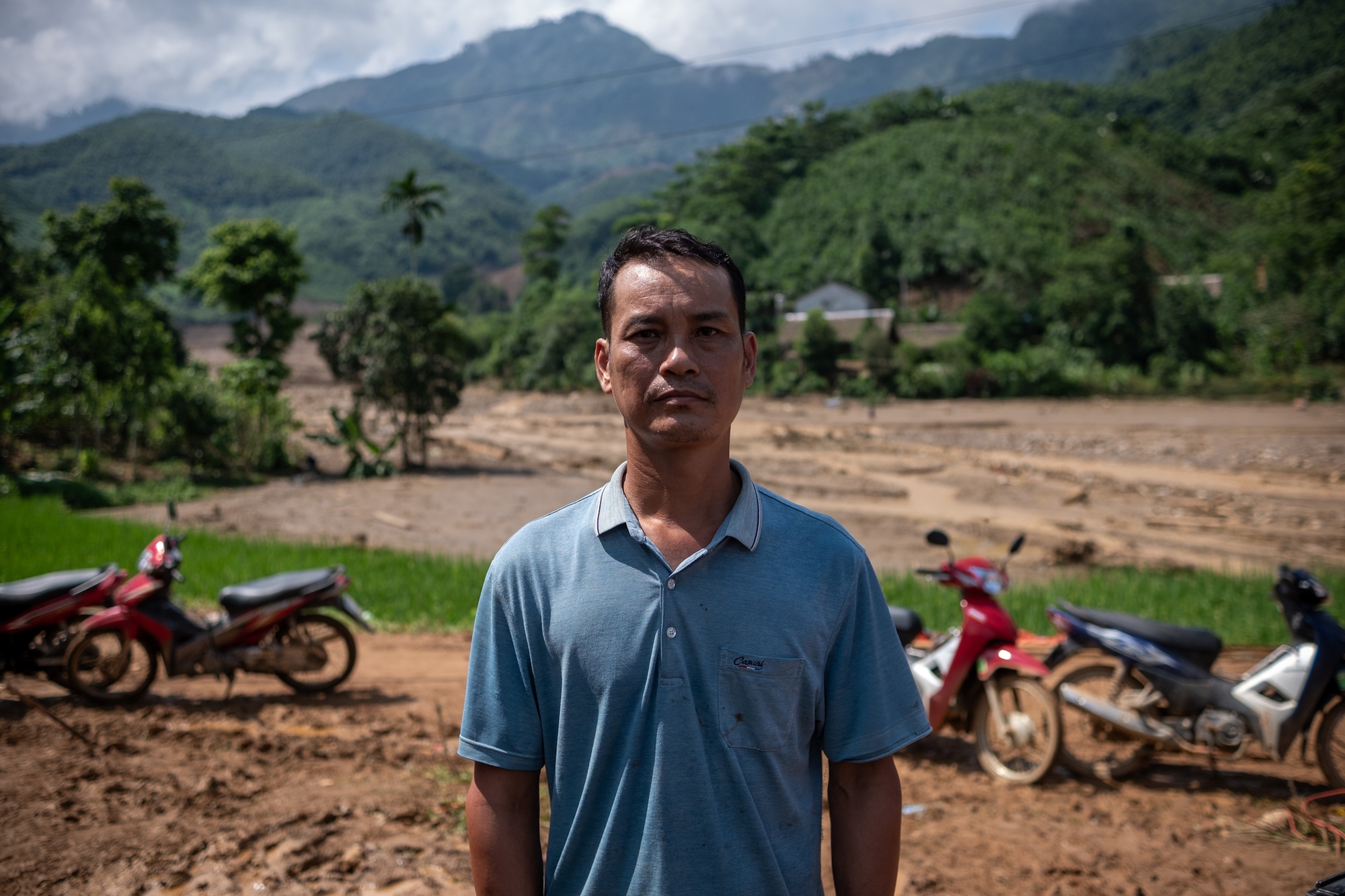 Chia sẻ với chúng tôi, anh Hoàng Văn Tiện cho biết sáng sớm ngày 10/9, trong lúc trời mưa to nên đi ra kiểm tra, khi sang nhà ông nội gần đó thì thấy 1 bên taluy đã bị sạt lở. Lúc quay về gần tới nhà thì nghe tiếng nổ rất lớn. Ngay sau đó trước mắt anh Tiện là cả một khối nước và đất bị hất tung trên trời. "Tôi chỉ kịp hô vợ con chạy thoát thân. Khoảng 3 phút sau nhìn lại thì cả làng đã bị đất san phẳng, chẳng còn gì".