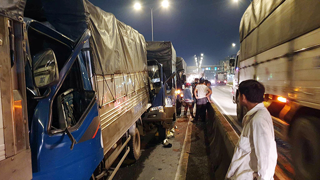 Khi leo lên dốc cầu An Sương, tài xế ô tô 7 chỗ giảm tốc đột ngột để né chướng ngại vật thì bị đoàn xe phía sau (gồm 4 xe tải, 1 xe container, 1 xe bán tải) lao tới đâm vào đuôi.