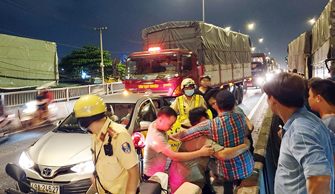Lực lượng CSGT có mặt để phong tỏa hiện trường, điều tra nguyên nhân.