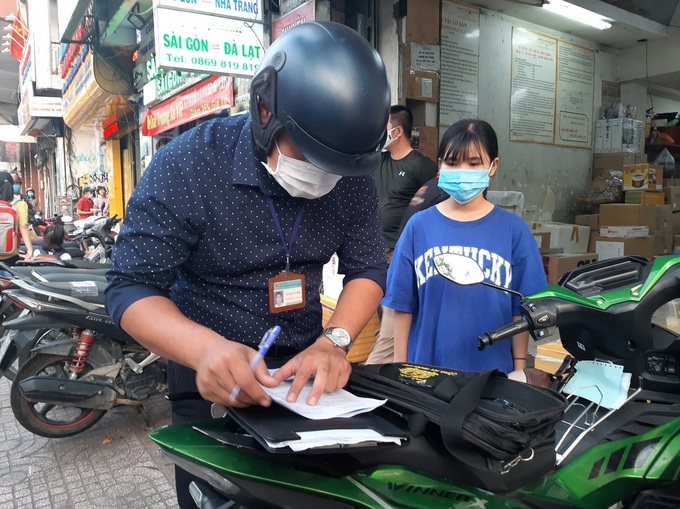 Tại trường THPT Ernst Thalmman, đường Trần Hưng Đạo, quận 1, một phụ huynh đứng trước cổng đón con không mang khẩu trang bị xử phạt. Người này tỏ thái độ bất hợp tác, không chịu xuất trình giấy tờ tuy thân, được đưa về Công an phường Phạm Ngũ Lão để làm việc.