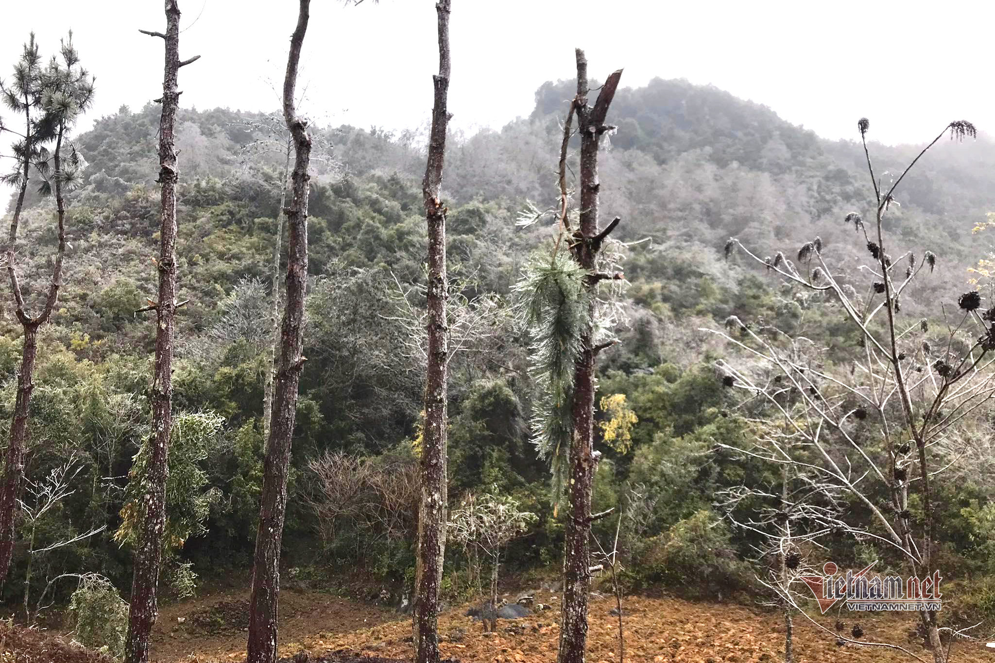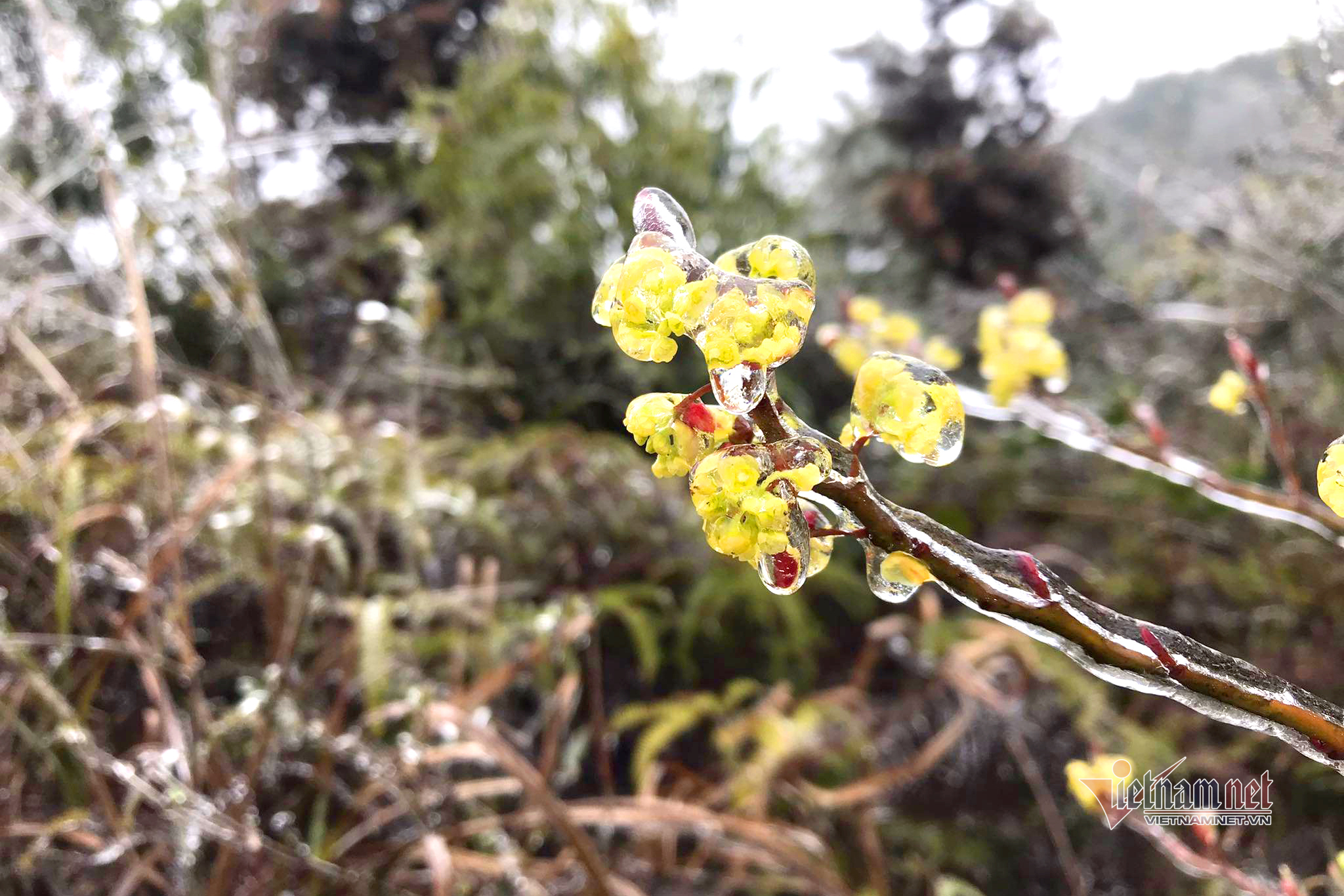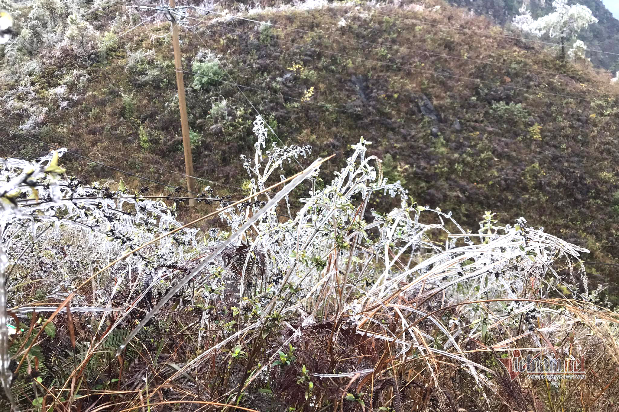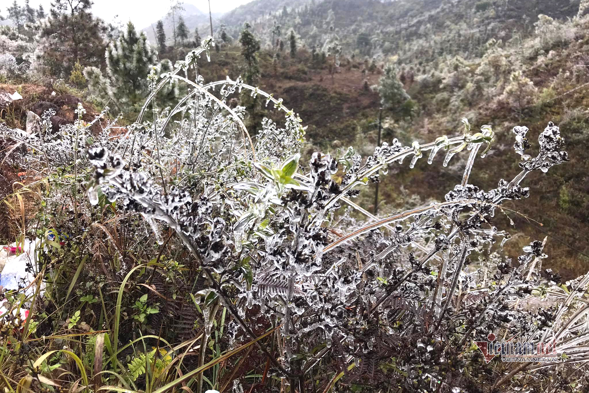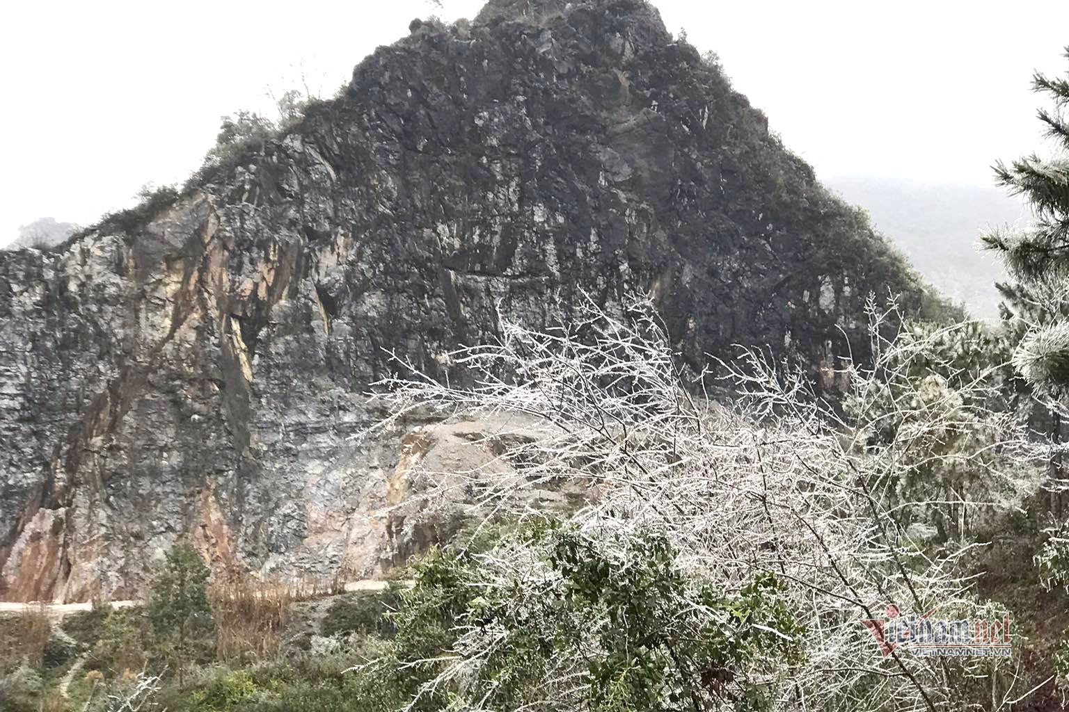 Mưa kèm gió lạnh, tại huyện Đồng Văn, Hà Giang nền nhiệt giảm xuống âm 1 độ, cây cối tại đây xuất hiện băng giá.
