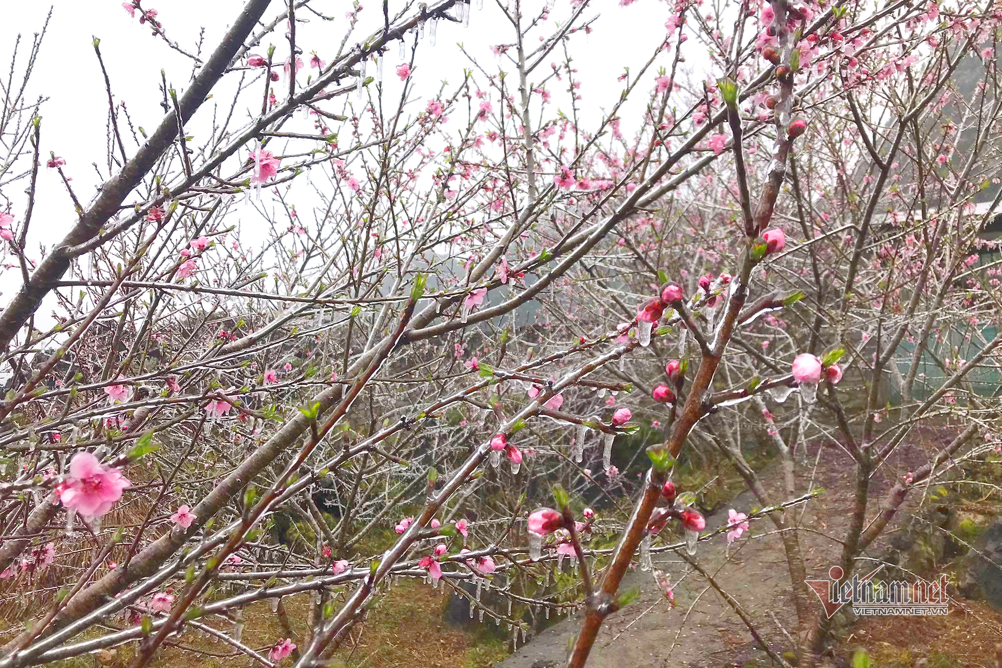 Đặc biệt, vườn hoa đào của người dân đóng băng từ gốc lên đến ngọn. Hoa được phủ một lớp băng tạo nên khung cảnh lạ mắt tuyệt đẹp.