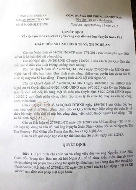 Quyết định tạm đình chỉ công tác với giám đốc và phó giám đốc Trung tâm Bảo trợ xã hội Nghệ An |