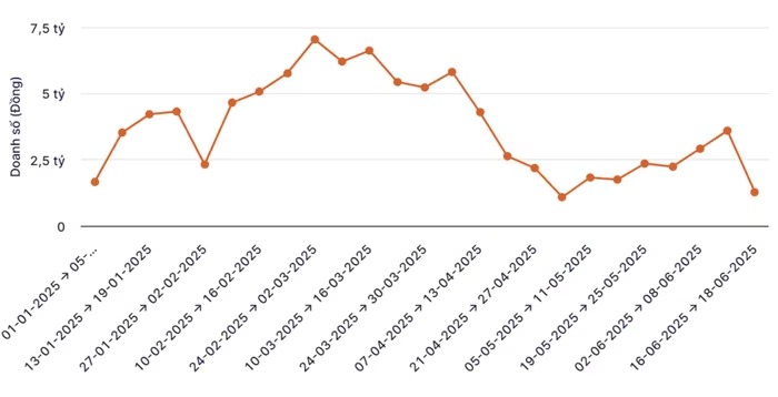 Đáng chú ý, TikTok Shop là kênh mang lại doanh thu chủ yếu cho thương hiệu, chiếm tới 91,6 tỷ đồng, trong khi Shopee chỉ đóng góp 2,5 tỷ đồng. Doanh thu của thương hiệu đạt đỉnh vào nửa cuối tháng 2, gần 7,5 tỷ đồng, sau đó có xu hướng giảm dần.