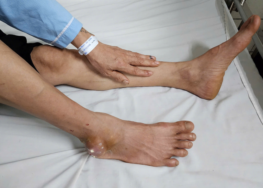 Dịp Tết do ăn uống không điều độ và uống thuốc không đều nên bệnh nhân xuất hiện sưng đau khớp cổ chân phải và vỡ hạt tophi mặt ngoài khớp cổ chân phải kèm theo sốt 39 độ C.