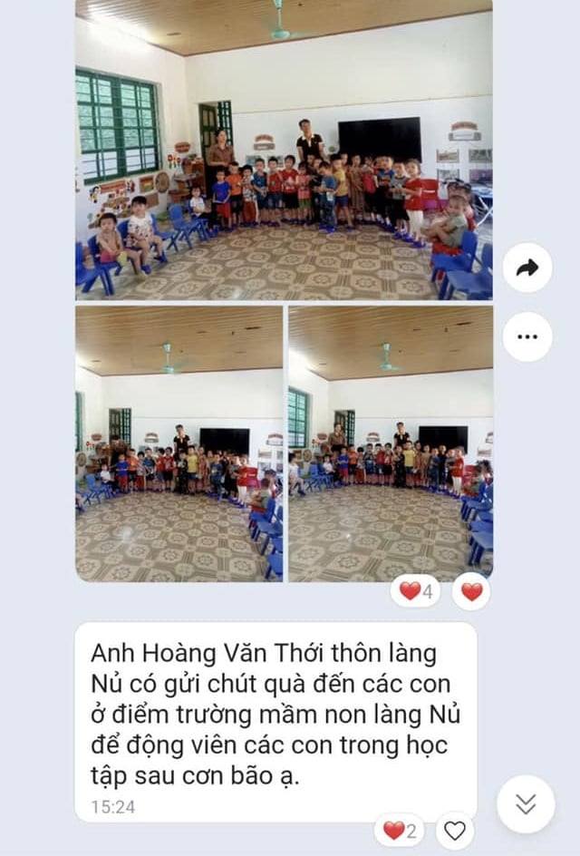 Mất vợ con nhưng cố nén nỗi đau, mới đây anh Hoàng Văn Thới tìm đến trường mầm non con từng theo học để tặng cho các cháu những món quà động viên sau trận bão lũ kinh hoàng vừa qua. Theo những thầy cô trong trường cho biết, anh gửi tặng mỗi bé 1 triệu đồng. Đây cũng là một cách anh ấy đền đáp tấm lòng của mọi người đã giúp đỡ anh.
