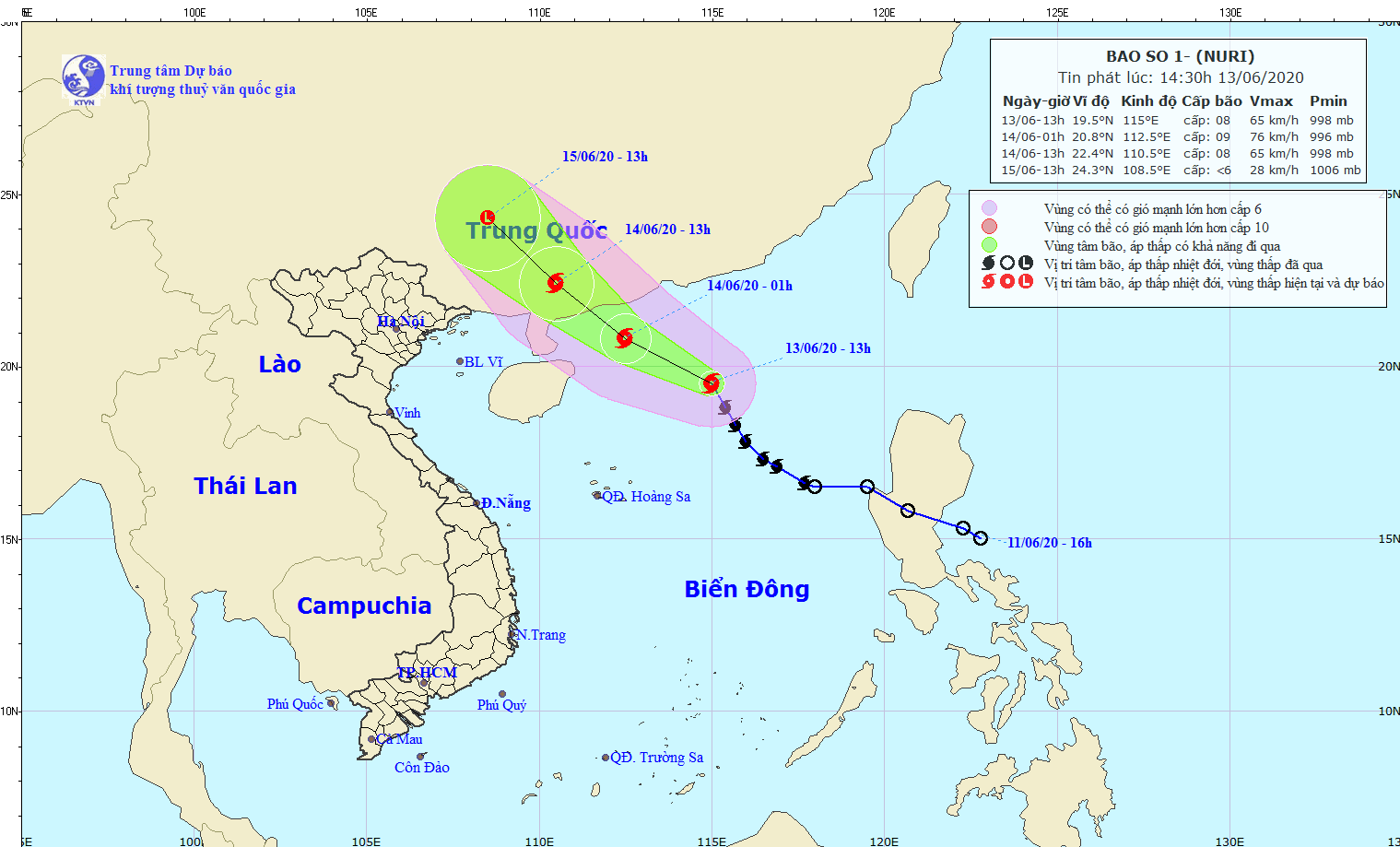 Đến 01 giờ ngày 14/6, vị trí tâm bão cách đất liền tỉnh Quảng Đông (Trung Quốc) khoảng 120km về phía Đông Nam. Sức gió mạnh nhất vùng gần tâm bão mạnh cấp 8-9 (60-90km/giờ), giật cấp 12.