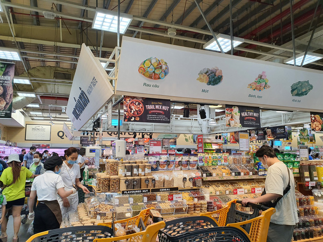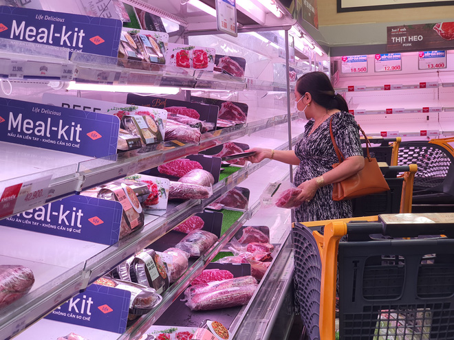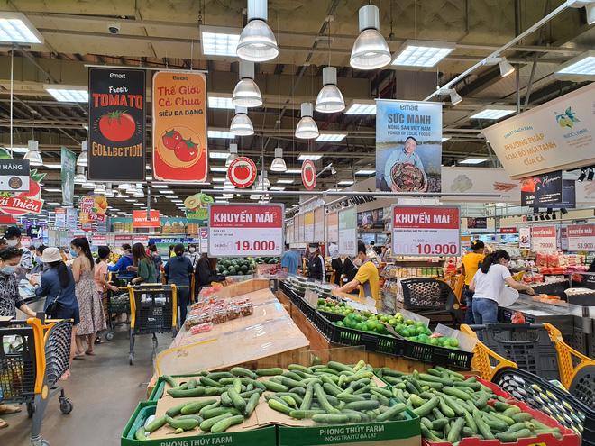 Ghi nhận của chúng tôi tại Emart Gò Vấp, lượng người dân kéo đến các quầy bán rau củ, cá thịt đông hơn mọi ngày. Ở một số khu vực trong siêu thị, đặc biệt là quầy thịt heo, nhiều người dân phải xếp hàng đợi đến lượt để mua thực phẩm tươi..., một số quầy khác cũng nhanh chóng cháy hàng.