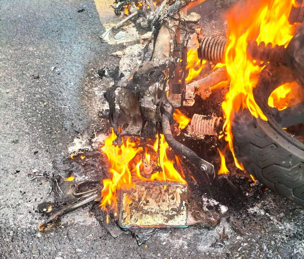 | Video chiếc xe máy bốc cháy ngùn ngụt sau khi ngã xuống đường do bị áo mưa quấn vào bánh |