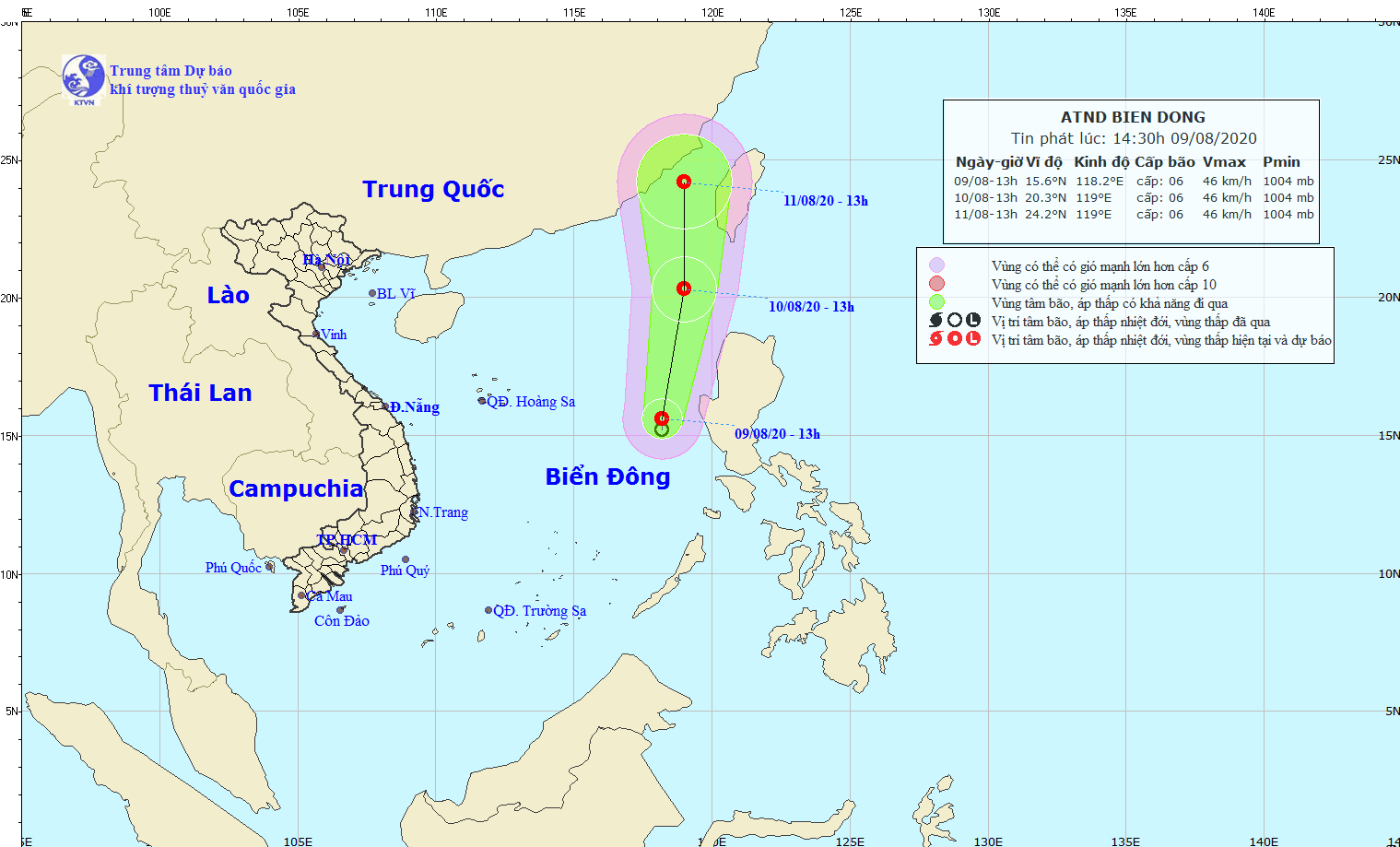 Đến 13 giờ ngày 10/8, vị trí tâm áp thấp nhiệt đới ở khoảng 20,3 độ Vĩ Bắc; 119,0 độ Kinh Đông, cách đảo Lu-dông (Phi-líp-pin) 270km về phía Tây Bắc. Sức gió mạnh nhất vùng gần tâm áp thấp nhiệt đới mạnh cấp 6 (40-50km/giờ), giật cấp 8.