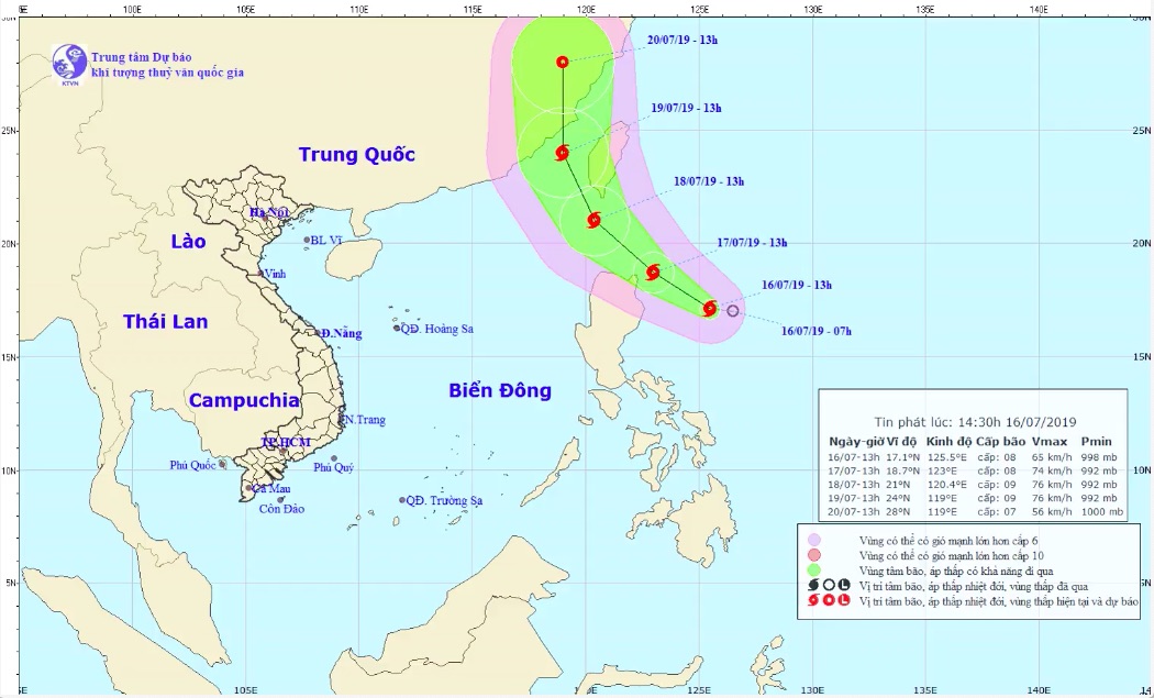 Dự báo trong 24 giờ tới, bão di chuyển theo hướng Tây Tây Bắc, mỗi giờ đi được 10-15km và có khả năng mạnh thêm. Đến 13 giờ ngày 17/7, vị trí tâm bão ở khoảng 18,7 độ Vĩ Bắc; 123,0 độ Kinh Đông, trên vùng biển phía Đông Bắc đảo Lu-dông. Sức gió mạnh nhất vùng gần tâm bão mạnh cấp 8 (60-75km/giờ), giật cấp 11.