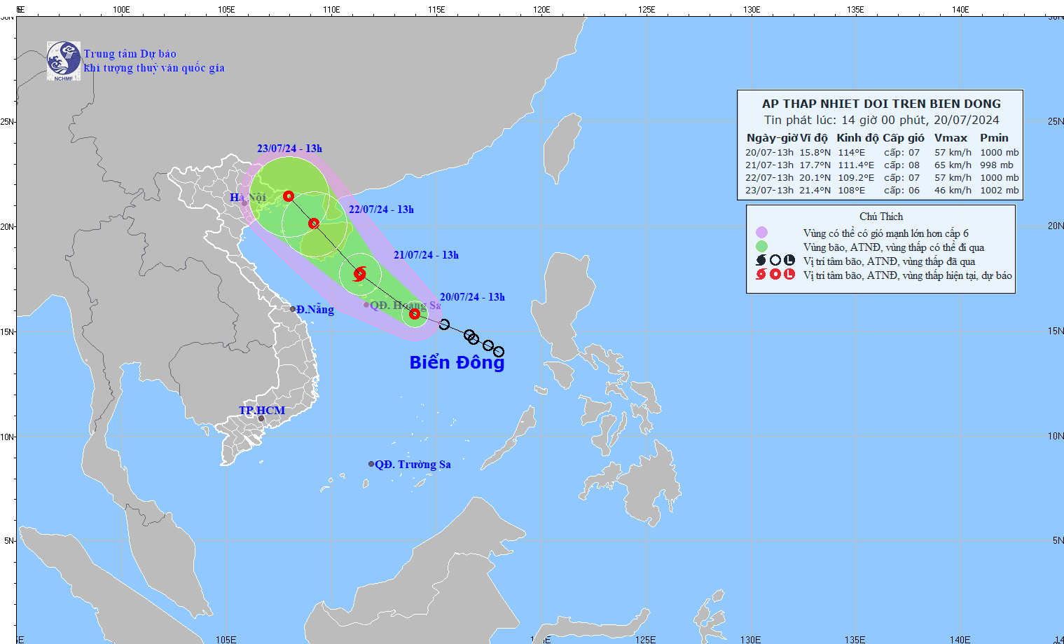 Hồi 13 giờ ngày 20/7, vị trí tâm áp thấp nhiệt đới ở vào khoảng 15,8 độ Vĩ Bắc; 114 độ Kinh Đông, cách Hoàng Sa khoảng 250km về phía Đông Đông Nam.