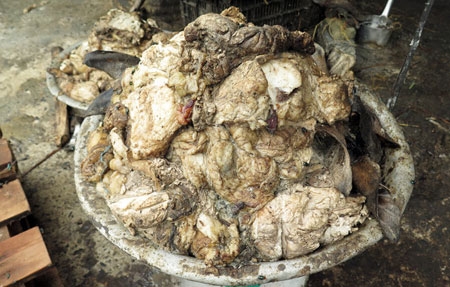 Mỡ tổng hợp, mốc xanh, bốc mùi hôi thối đang chuẩn bị được đưa vào lò chiên - Ảnh: QUANG THẾ |