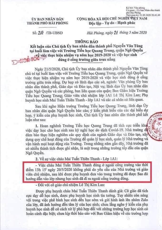 Ngày 23/5, bà Mùi ở phường Vạn Mỹ, quận Ngô Quyền cho biết không đồng ý với thông báo của UBND thành phố kết luận: "Việc cháu Mai Tuấn Thiên Thanh, lớp 1A trường Tiểu học Quang Trung, đứng ở ngoài cổng trường vào 13h15 ngày 20/5 không phải do yêu cầu của nhà trường và giáo viên chủ nhiệm. Sau khi được phụ huynh đưa vào trong trường, cháu đã được Sao đỏ hướng dẫn vào lớp nhưng đã đi ra cổng đứng".