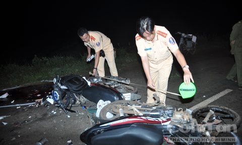 Hai thanh niên chạy xe máy tốc độ nhanh trong đêm, tông nhau trực diện khiến một người chết tại chỗ, người còn lại bị thương nặng đang được cấp cứu.