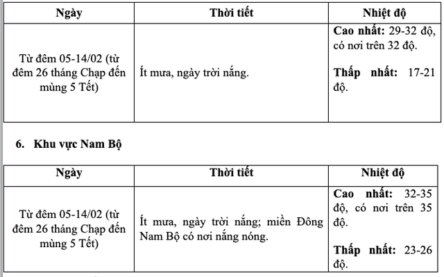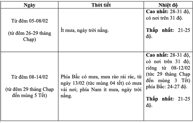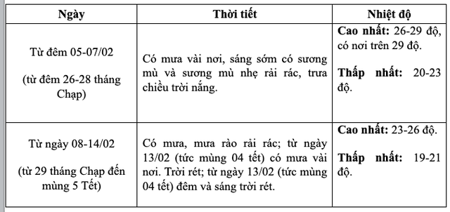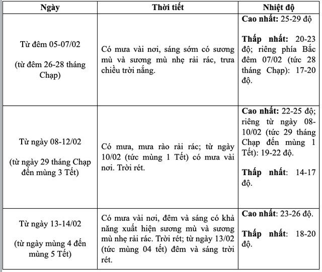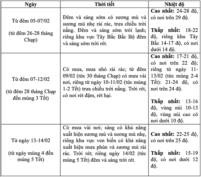 Từ 8 - 10/2 (29 tháng Chạp đến mùng 1 Tết), không khí lạnh mạnh khiến nền nhiệt ở miền Bắc hạ xuống thấp nhất 13 - 16 độ, vùng núi cao có nơi dưới 9 độ; trời rét diện rộng và kéo dài qua mùng 1 Tết Nguyên đán.