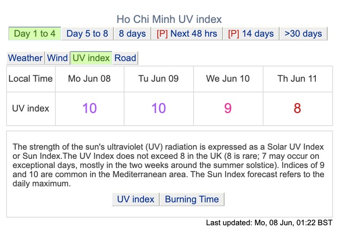Weather thông tin: "Tổ chức Y tế thế giới (WHO) cho rằng khi chỉ số tia UV mức 8-10, tiếp xúc trực tiếp với ánh nắng từ 25 phút sẽ bị bỏng da, nguy hiểm đến mắt (điển hình đục thủy tinh thể, thoái hóa hoàng điểm)...".