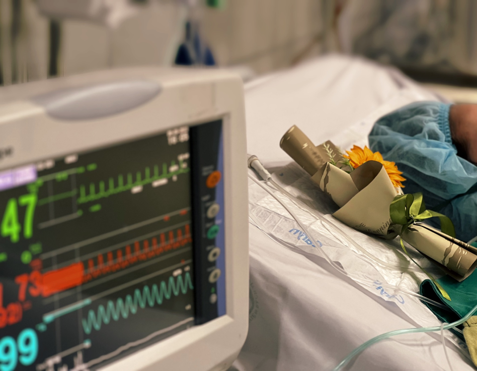 Giữa máy móc, dây truyền và âm thanh tít tít từng hồi quanh cô con gái tuổi 13, người cha đặt bông hoa bên cạnh và đứng nhìn hồi lâu.