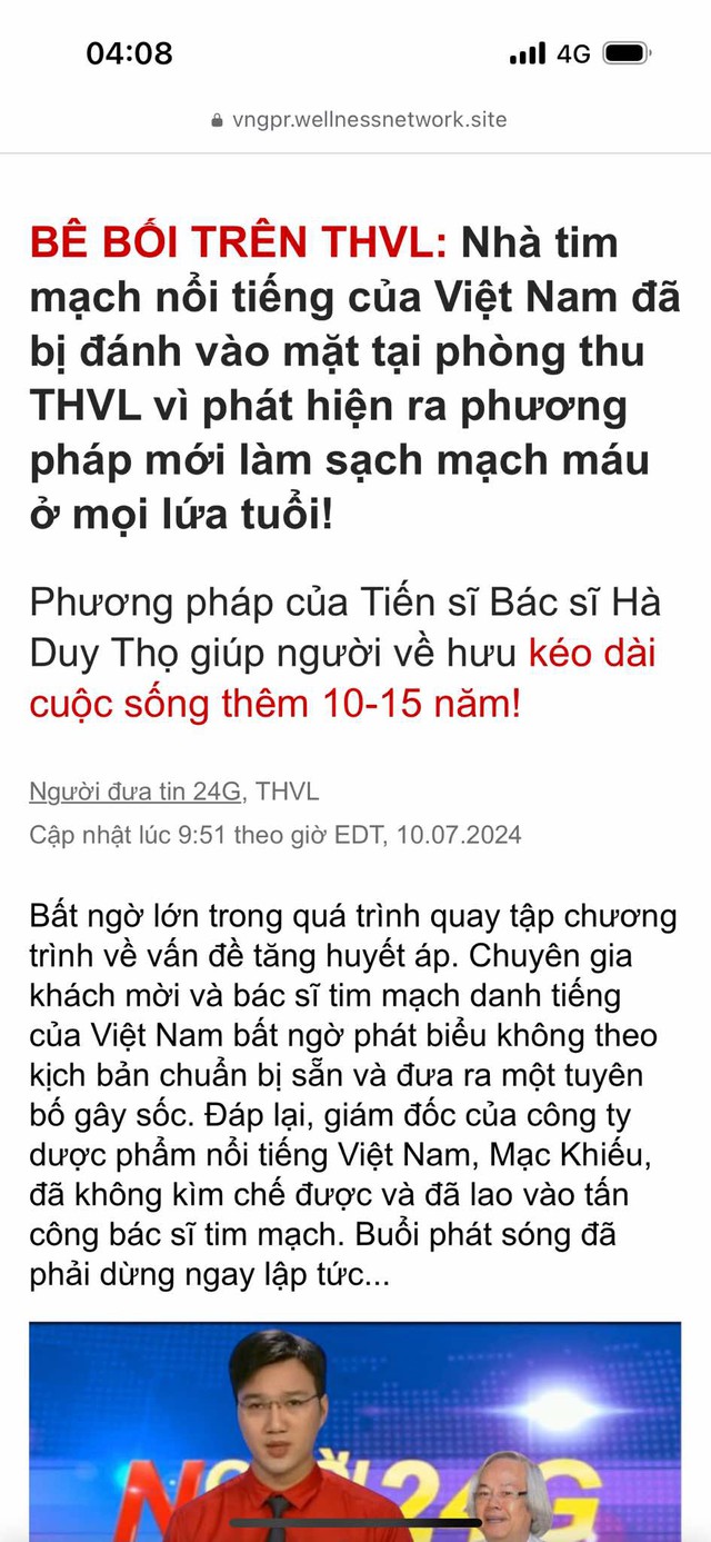 Nhiều ngày qua, mạng xã hội xôn xao trước một tài khoản Facebook tên N.R đăng tải bài viết với tựa đề "Tôi không thể tin được câu chuyện này là sự thật". Nội dung bài viết đăng tải: "Bê bối trên THVL: Nhà tim mạch nổi tiếng của Việt Nam đã bị đánh vào mặt tại phòng thu THVL vì phát hiện ra phương pháp mới làm sạch mạch máu ở mọi lứa tuổi!".