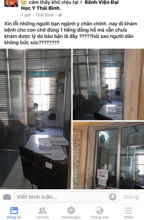 Anh Trung cho hay, ngày 12/8, anh đưa con trai 9 tuổi đi khám bệnh ở Khoa Tai mũi họng - Bệnh Viện Đại học Y Thái Bình từ 8h15’, cũng xếp phiếu ở phòng khám và đợi như rất nhiều người khác, nhưng thời gian chờ đợi kéo dài lâu do bác sĩ bận với chiếc điện thoại.