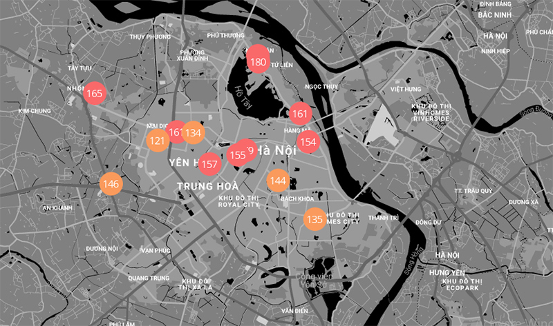 Chất lượng không khí ở Hà Nội sáng nay tại các điểm do trang Air Visual cung cấp