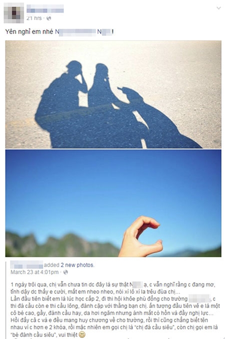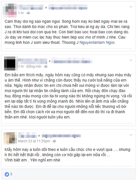 "Mấy hôm nay anh luôn dõi theo em luôn cầu chúc cho em vượt qua... nhưng giờ thì hết hết thật rồi, không còn cơ hội gặp lại em nữa rồi...Vĩnh biệt em. Yên nghỉ em nhé!", một người bạn đau buồn chia sẻ khi hay tin cô gái 9X không qua khỏi trong vụ tai nạn.