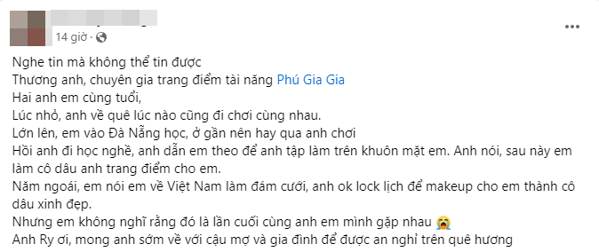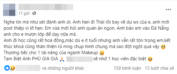 Một người bạn của nam makeup artist xúc động tưởng nhớ: "Đứa em tài năng dễ thương, lúc trước có gì ngon cũng mang qua nhà anh, còn giới thiệu rất nhiều khách cho anh nữa. Lâu nay em bận rộn với công việc quá mà cũng ít gặp, em bảo do em rảnh thì anh toàn bận. Rồi giờ không còn được gặp em nữa rồi. Trân quý em…".
