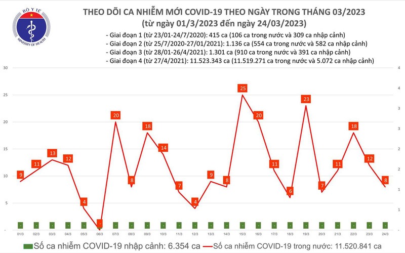 Bản tin phòng chống dịch COVID-19 ngày 24/3 của Bộ Y tế cho biết có 8 ca mắc mới, giảm nhẹ so với ngày trước đó.