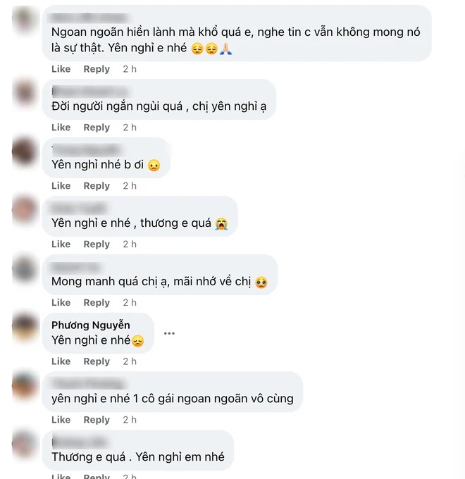 "Thương chị, tiếc cho 1 tuổi thanh xuân đang còn dang dở. Hãy nhớ rằng là dù nơi nào vẫn luôn xinh đẹp, luôn hạnh phúc nhé chị. Mong gia đình chị sớm vượt qua nỗi đau này", tài khoản A.L gửi lời tiếc thương.