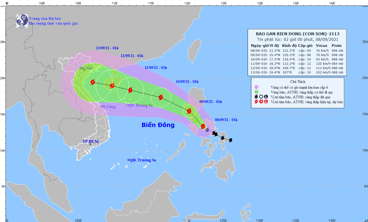 Trong 24 đến 48 giờ tiếp theo, bão di chuyển theo hướng Tây Bắc, mỗi giờ đi được 15-20km, đi vào Biển Đông và có khả năng mạnh thêm. Đến 01 giờ ngày 10/9, vị trí tâm bão ở khoảng 17,3 độ Vĩ Bắc; 116,4 độ Kinh Đông, cách quần đảo Hoàng Sa khoảng 440km về phía Đông. Sức gió mạnh nhất vùng gần tâm bão mạnh cấp 9-10 (75-100km/giờ), giật cấp 12.