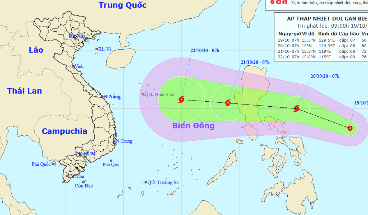 Đến 7h ngày 21-10, vị trí tâm bão ở cách quần đảo Hoàng Sa khoảng 770km về phía Đông Đông Nam. Sức gió mạnh nhất vùng gần tâm bão mạnh cấp 8 (60-75km/h), giật cấp 10.