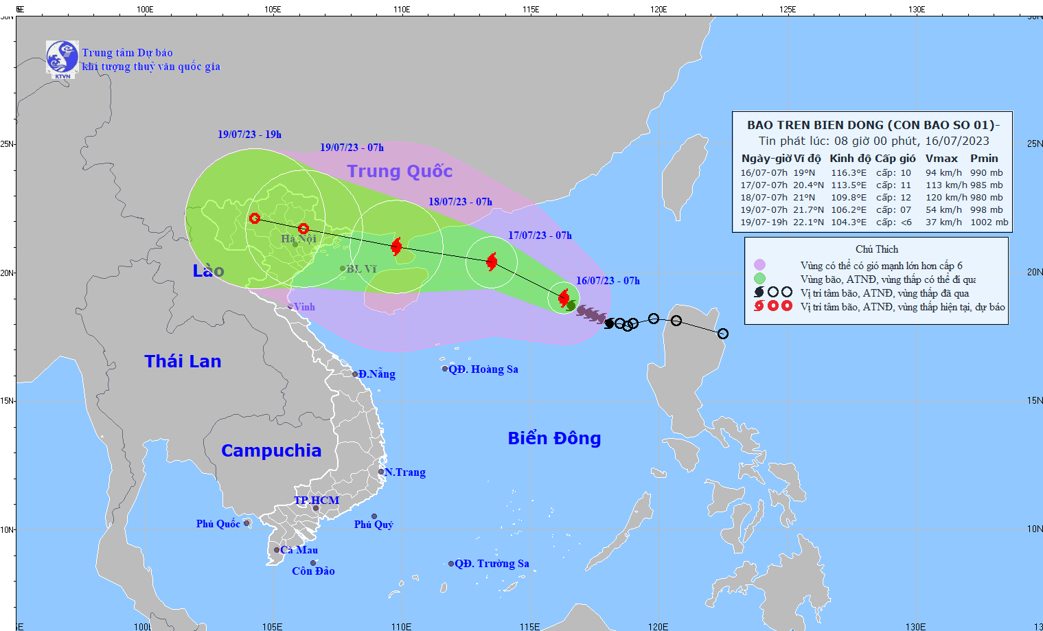 Theo thông tin từ Dân Trí, trưa 16/7, Trung tâm Dự báo Khí tượng Thủy văn Quốc gia cho biết bão số 1 duy trì sức gió mạnh cấp 9-10 (75-102km/h), giật cấp 13. Lúc 10h, tâm bão nằm cách bán đảo Lôi Châu (Trung Quốc) khoảng 610km về phía đông đông nam.