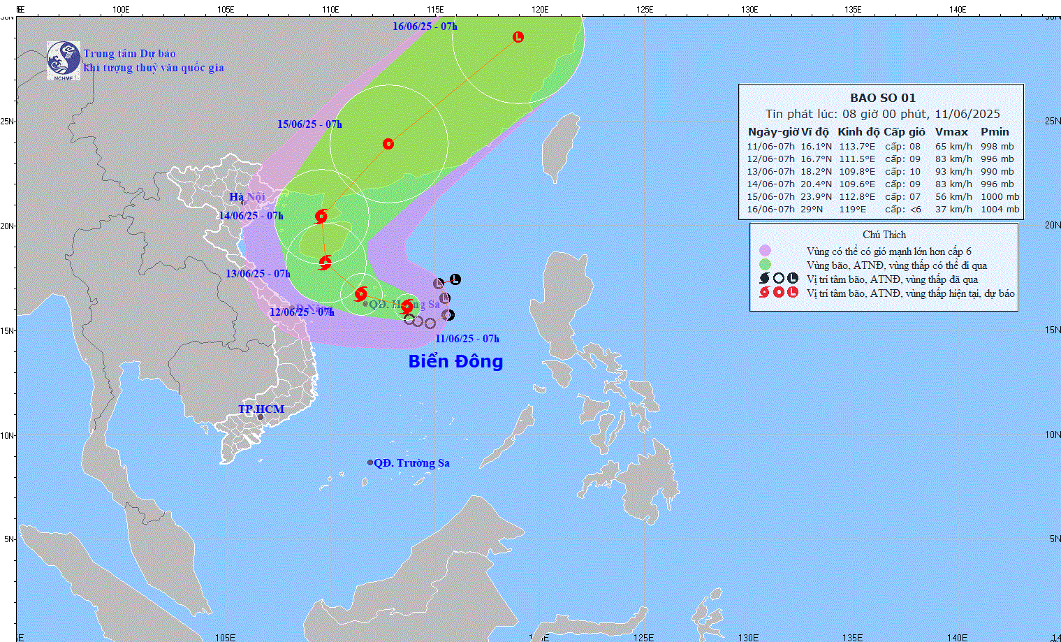 Hồi 7h, vị trí tâm bão ở vào khoảng 16,1 độ Vĩ Bắc; 113,7 độ Kinh Đông trên vùng biển phía Đông quần đảo Hoàng Sa. Sức gió mạnh nhất vùng gần tâm bão mạnh cấp 8 (62-74km/h), giật cấp 10; di chuyển chậm theo hướng Tây Tây Bắc với tốc độ khoảng 5-10km/h.