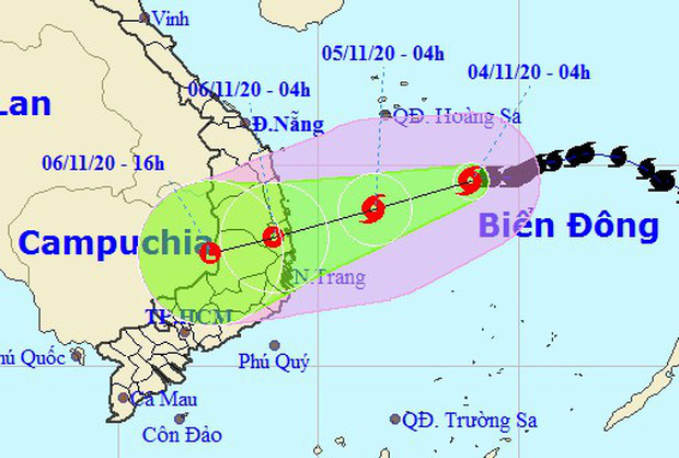 Dự báo trong 24 giờ tới, bão di chuyển theo hướng Tây Tây Nam, mỗi giờ đi được khoảng 10km. Đến 04 giờ ngày 05/11, vị trí tâm bão ở khoảng 13,9 độ Vĩ Bắc; 111,4 độ Kinh Đông, cách Quảng Ngãi đến Khánh Hòa khoảng 230km về phía Đông. Sức gió mạnh nhất vùng gần tâm bão mạnh cấp 8-9 (60-90km/giờ), giật cấp 11.