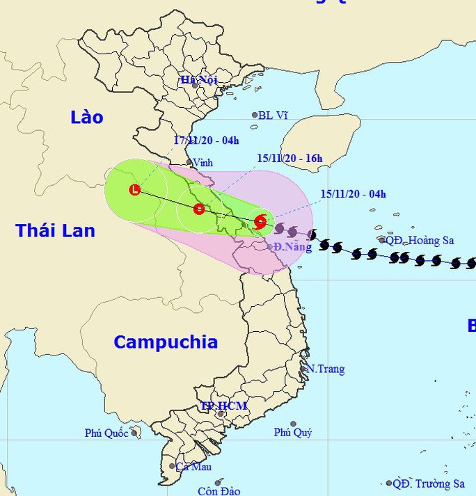 Theo Trung tâm Dự báo khí tượng thủy văn quốc gia, trong 6 giờ từ 19 giờ ngày 14-11 đến 1 giờ ngày 15-11, ở các tỉnh từ Quảng Trị đến Quảng Ngãi đã có mưa, có nơi mưa vừa, mưa to như: hồ chứa nước Thủy Yên 108,2 mm, Hương Phú 81 mm, Nam Đông (Thừa Thiên - Huế) 66 mm, trạm Kiểm lâm Sông Bắc (Đà Nẵng) 110,4 mm...